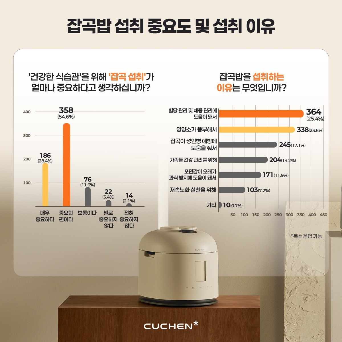 쿠첸 관계자는 "이번 조사를 통해 소비자들이 식습관 관리를 건강의 핵심으로 보고 있으며 잡곡밥 섭취를 그 기본으로 삼는 것을 확인했다"며, "변화하는 소비자의 건강 트렌드와 잡곡 섭취 니즈에 맞춰 한국인의 건강한 식문화를 지속적으로 선도해 나갈 계획"이라고 밝혔다.