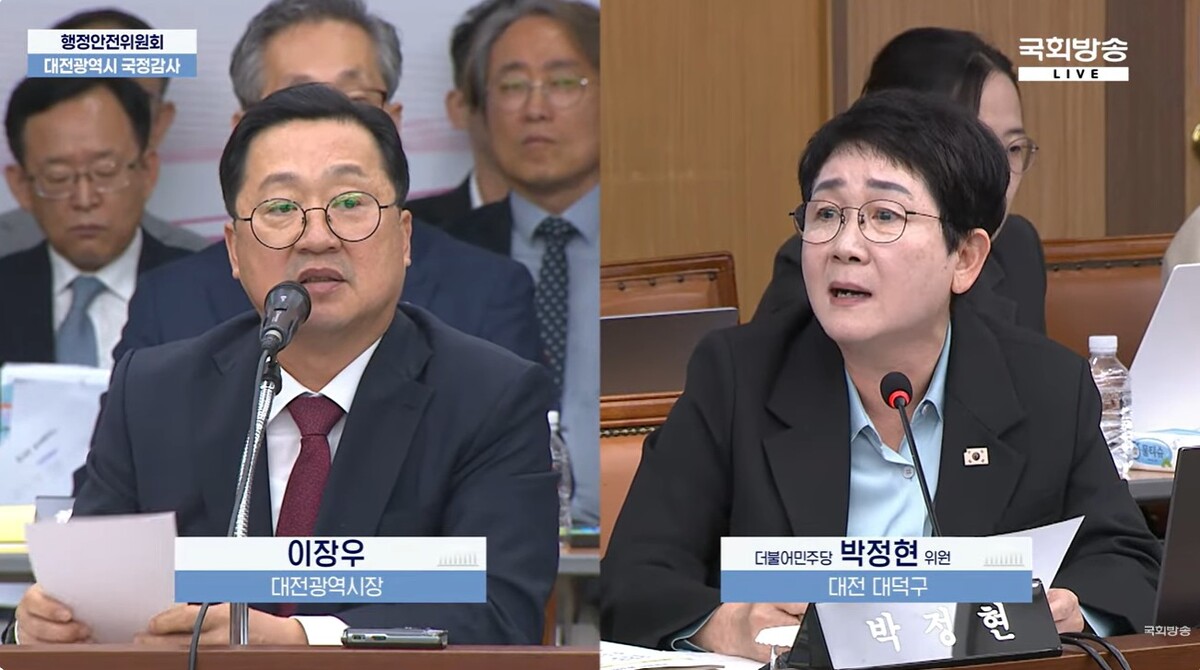 신정훈 행안위원장이 이 시장에게 “의원의 말을 듣고 답변하라”고 제지하며 상황을 진정시켰다. 이날 조춘생 의원은 대전시에 12·3 비상계엄 선포 당시 이 시장의 관용차 기록을 요청했다.