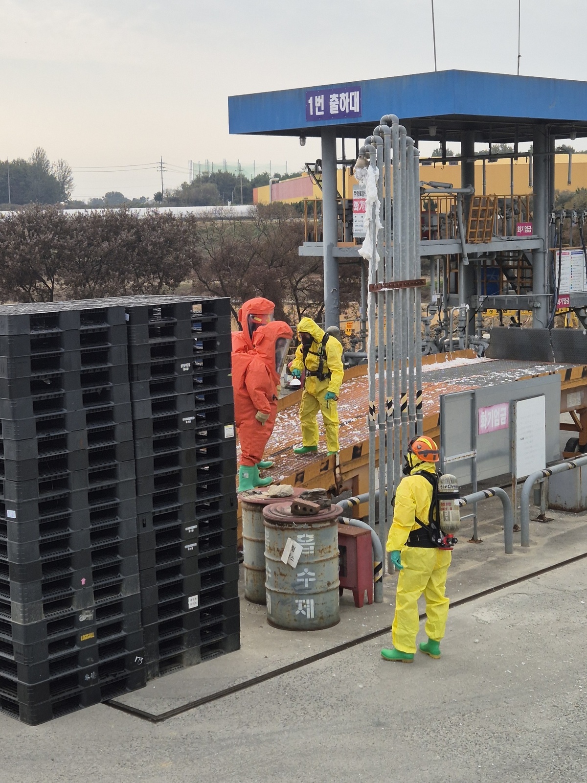 충북 음성군 대소면 미곡리의 석유 판매업체에서 26일 오전 화학물질이 누출돼 소방당국이 현장을 통제하고 있다. 음성소방서 제공