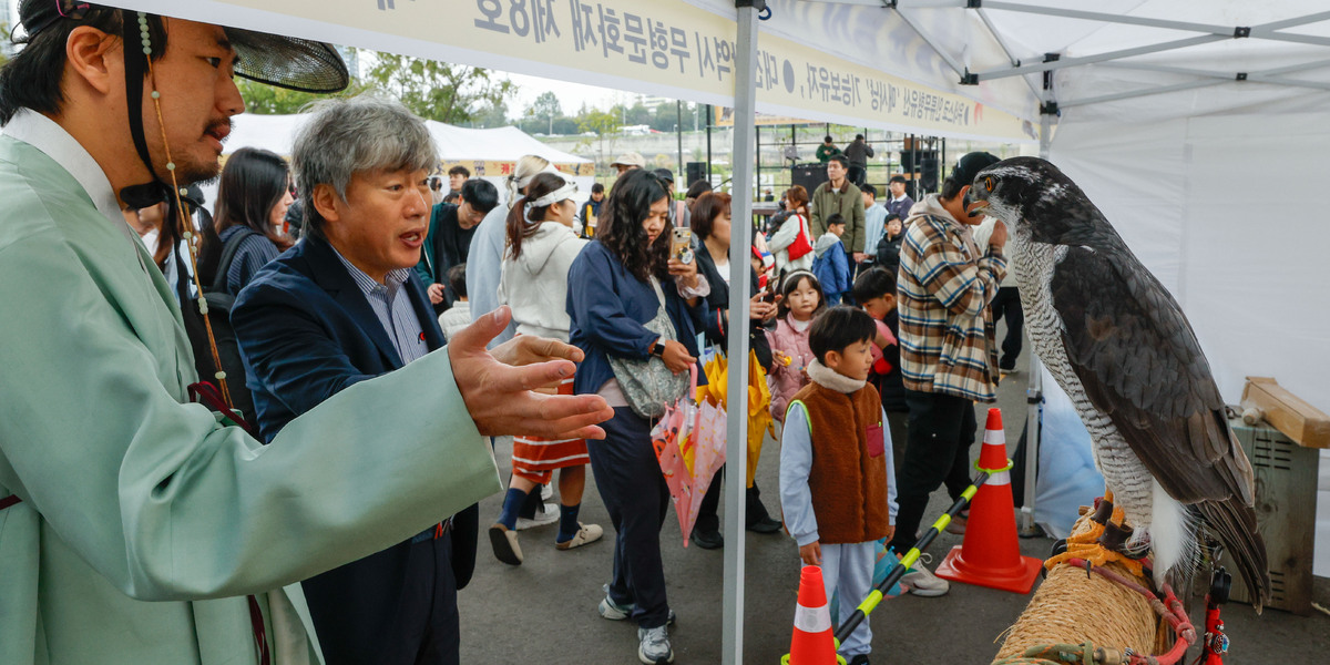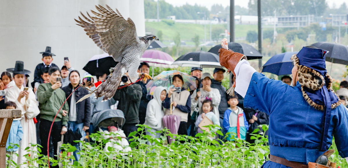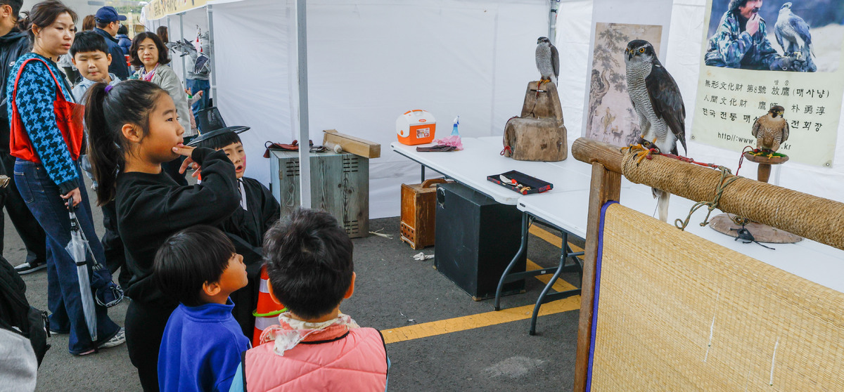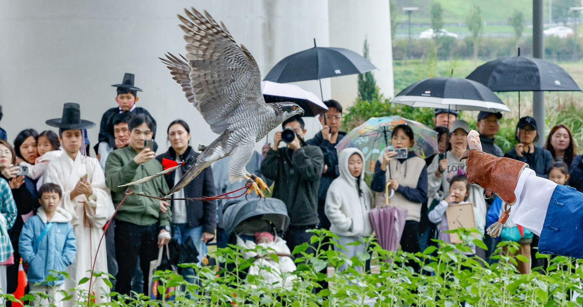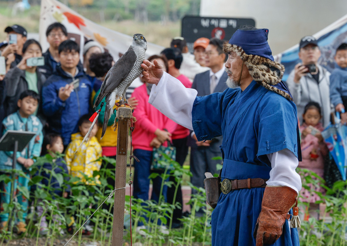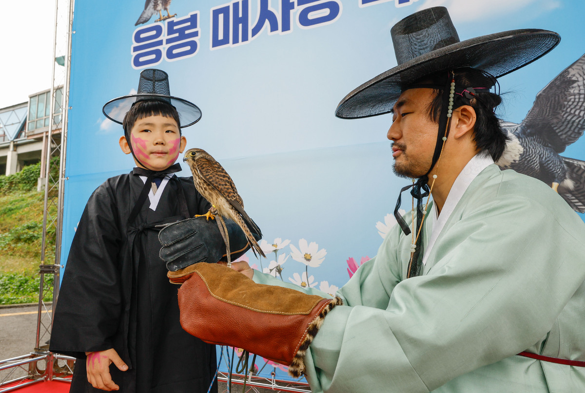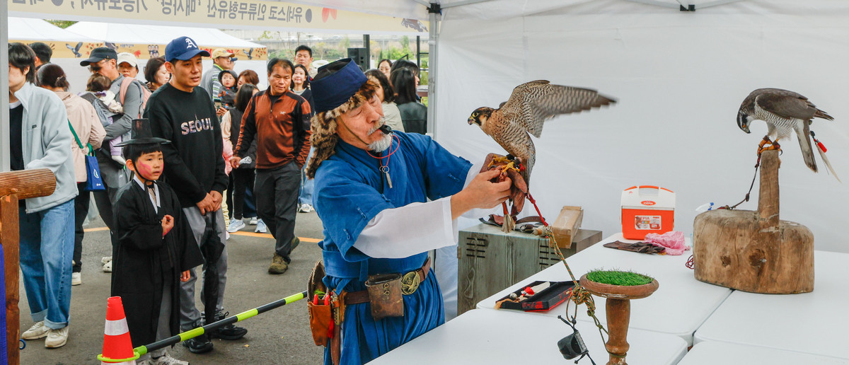 축제의 묘미로 무형문화재 박용순 응사(매사냥꾼)가 매사냥을 직접 시연한다.