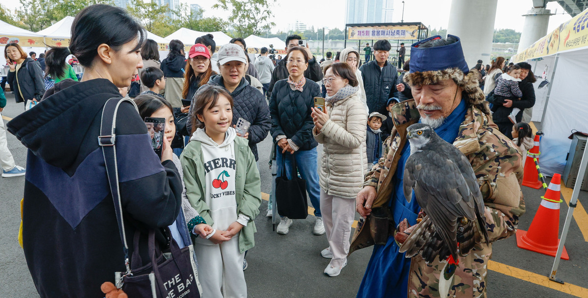 26일 서울 성동구 응봉역 인근에서 제5회 응봉 매사냥 축제가 열린 가운데 시민들이 매사냥 시연 및 체험을 하고 있다.