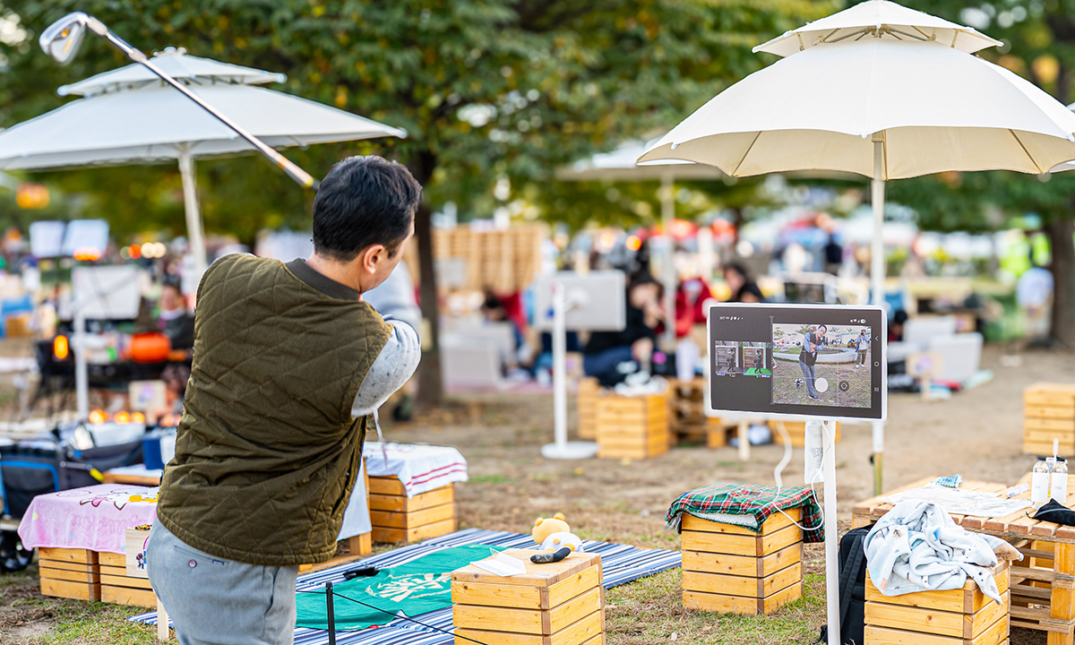 LG전자가 이동식 스크린 ‘스탠바이미 2’의 다양한 활용성을 알리는 이색 콘테스트를 지난 25일 서울 여의도 한강공원에서 개최했다. 스탠바이미 2는 버튼 하나로 화면부를 스탠드와 손쉽게 분리해 다양한 공간에서 활용할 수 있는 신개념 이동식 스크린이다. 사진은 콘테스트에서 ‘시선강탈상’을 받은 참가자가 휴대폰 미러링으로 스탠바이미 2를 통해 본인의 골프 스윙 자세를 실시간으로 확인하는 모습.