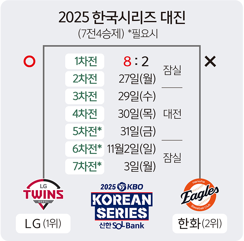 하지만 KS에 선착해 20일 이상 쉬면서 체력을 비축한 LG가 PO에서 격전을 벌이며 지친 한화를 압도했다. LG는 1차전에서 선발투수 앤더슨 톨허스트가 6이닝 7피안타 7탈삼진 2실점으로 한화 타선을 봉쇄했고 주장 박해민이 솔로 홈런포에 멋진 호수비까지 선보인 데 힘입어 8-2로 승리했다. 역대 한국시리즈에서는 1차전 승리 팀이 41번 중 30차례 정상에 올라 우승 확률 73.17%에 달한다.