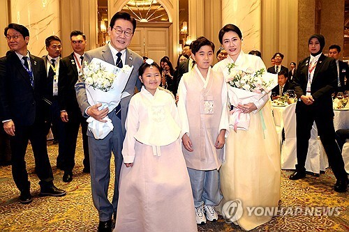 행사에서는 이 대통령과 한복 차림의 김혜경 여사가 화동으로부터 꽃다발을 건네받기도 했다.