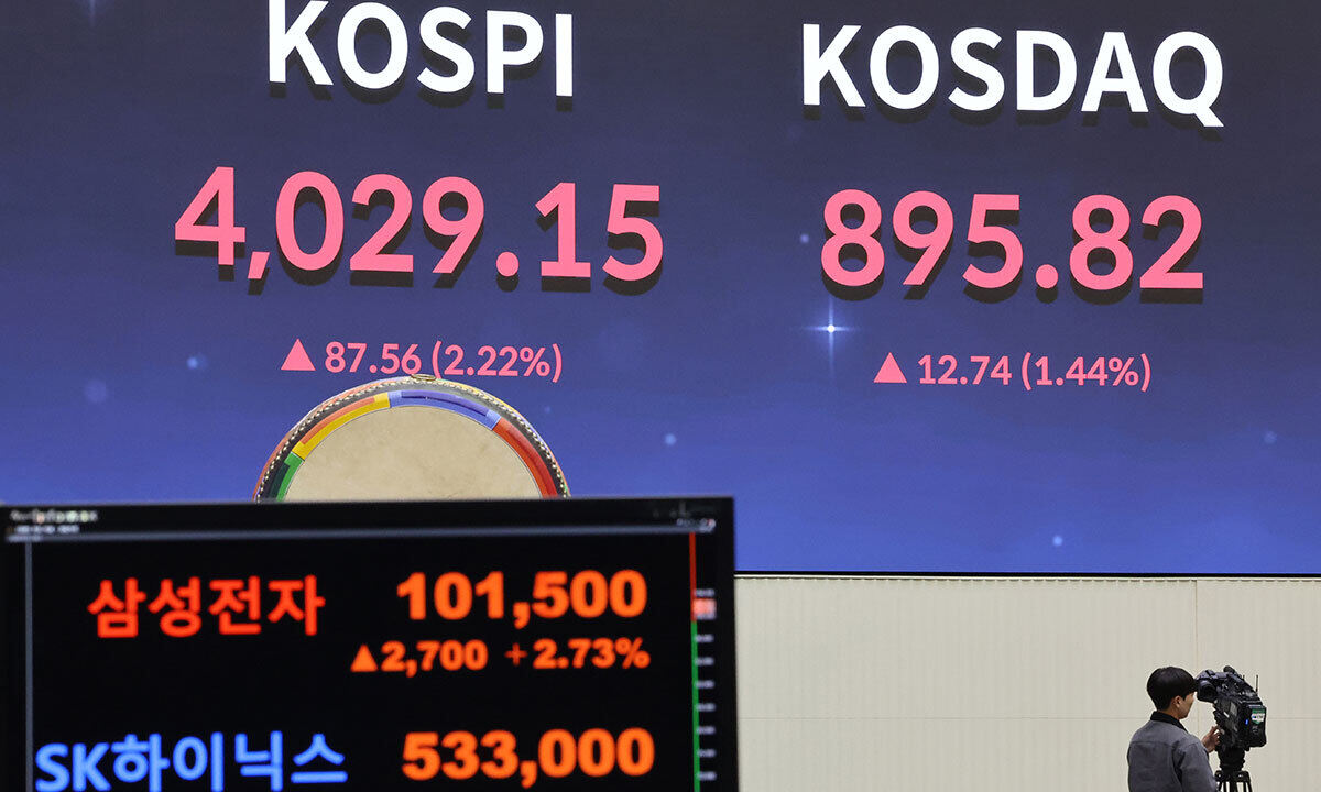 코스피가 27일 처음 4000선을 돌파했다. 이날 오전 9시30분 현재 코스피는 전장 대비 70.48포인트(1.79%) 오른 4012.07을 기록 중이다. 지수는 전장보다 58.20포인트(1.48%) 오른 3999.79로 출발해 상승 폭을 키웠고, 한때 4021.93까지 오르며 사상 최고치를 새로 썼다. 투자자별로는 외국인이 1773억원 순매수하고 있고 개인과 기간이 각각 543억원, 1182억원 순매도하는 중이다.
