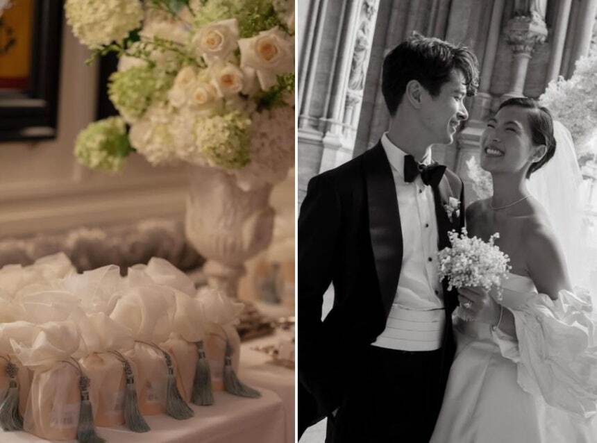 공개된 사진 속에는 하얀 실크 보자기에 싸인 양초 답례품이 가지런히 놓여 있었다. 전통 장신구인 노리개 태슬로 감싸 한국적 아름다움을 한층 강조했다.