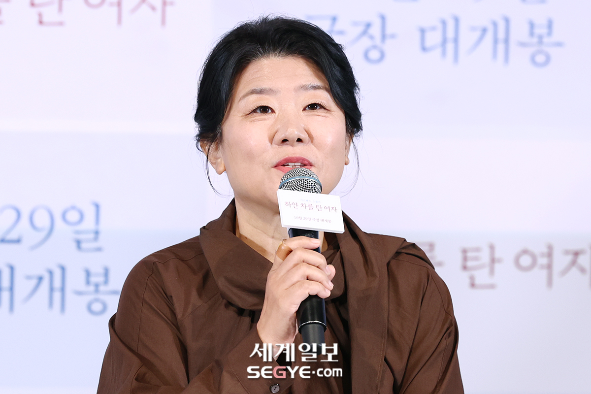 배우 이정은이 27일 서울 용산 CGV에서 열린 영화 ’하얀 차를 탄 여자’의 언론시사회에 참석해 인사말을 하고 있다.