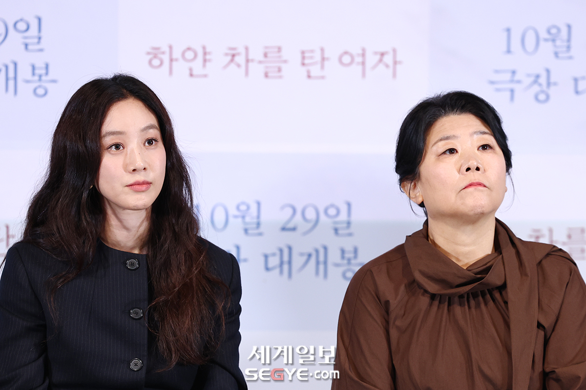 배우 정려원(사진 왼쪽)과 이정은이 27일 서울 용산 CGV에서 열린 영화 ’하얀 차를 탄 여자’의 언론시사회에 참석해 취재진의 질문을 경청하고 있다.