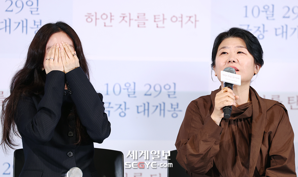 배우 정려원(사진 왼쪽)과 이정은이 27일 서울 용산 CGV에서 열린 영화 ’하얀 차를 탄 여자’의 언론시사회에 참석해 대화를 나누고 있다.