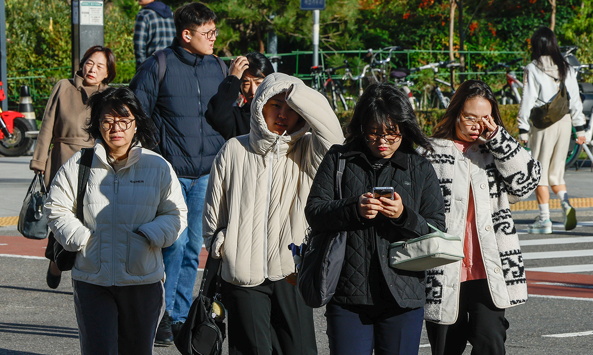 서울의 아침 최저기온이 4도를 기록하는 등 초겨울 날씨를 보인 27일 서울 용산역 인근 건널목에서 두꺼운 외투를 입은 시민들이 출근길을 서두르고 있다.