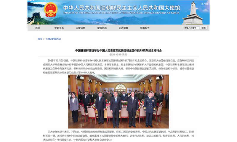 이는 주북한 중국대사관이 지난 25일 개최한 항미원조(한국전쟁) 출국 작전 75주년 기념 리셉션 소식을 홈페이지를 통해 공개하면서 알려졌다.