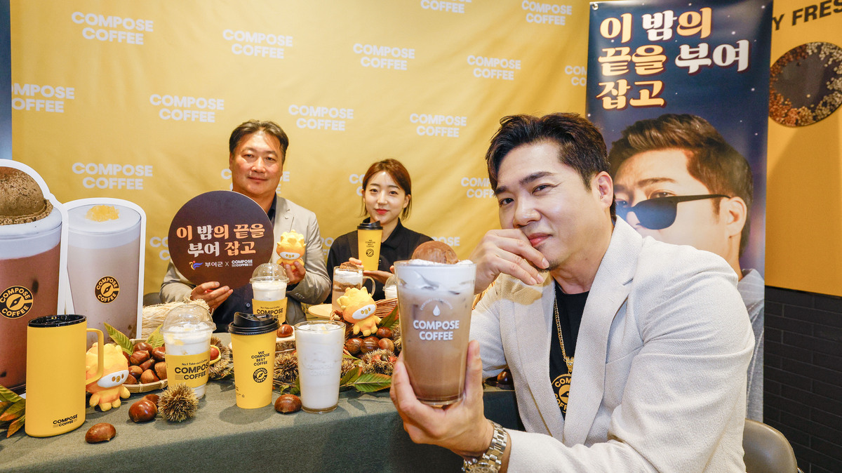 가수 김조한이 27일 서울 종로구 컴포즈커피 종로6가점에서 '부여 밤'을 활용한 신메뉴 부여밤라떼, 부여밤생초콜릿라떼를 소개하고 있다. 이번 신메뉴 2종은 28일부터 출시되며 일반 밤에 비해 당도가 약 1.5배 높고 식감이 부드럽고 고소한 부여 밤을 사용해 밤 고유의 깊은 단맛과 은은한 향을 살린 것이 특징이다.