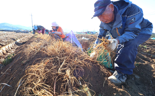 27일 인천 강화군 양도면 한 인삼밭에서 농민들이 6년근 인삼을 수확하고 있다. 강화군 인삼은 고려 인삼의 원산으로 1953년부터 재배되고 있다.