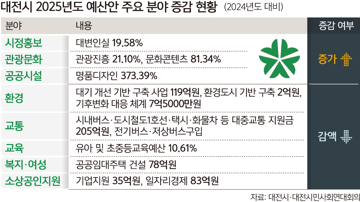 시의 2024년도 예산과 올해 예산의 주요 분야 증감 현황을 보면 이장우 대전시장의 공약 사업과 시정 홍보에 예산을 몰아준 반면 환경·소상공인·공동체역량사업 등의 예산은 대폭 칼질했다.