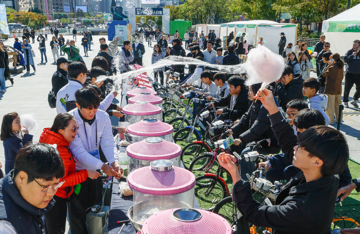 27일 서울 종로구 광화문광장에서 진행된 제3회 ‘지구하다 페스티벌’ 행사장에서 시민과 관광객들이 자가발전 자전거 체험을 하고 있다. 한국환경보전원은 국민이 직접 참여해 탄소중립의 의미를 배우고 생활 속 실천 방안을 공유할 수 있게 탄소 저감과 친환경 실천을 주제로 다양한 행사를 마련했다.
