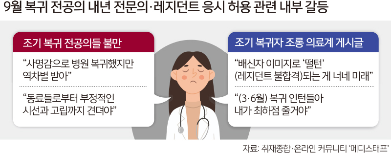 의료계 전용 온라인 커뮤니티에서는 조기 복귀 전공의들에 대해 조롱하는 게시글이 이어지고 있다. ‘3·6감(해당 월 복귀) 인턴 인생 망했네’라는 제목의 글에는 ‘조금의 손해도 보기 싫어 친구·동료·인맥 다 버리고 (병원에) 들어갔지만, 결국 (9월 복귀자) 선지원 허용해 주면서 평판 바닥’이라는 내용이 담겼다. 레지던트로 추정되는 작성자는 “3, 6월 전공의 복귀자(인턴)에게 최하점을 주겠다”고 썼다. 복지부 관계자는 역차별 논란 등에 대해 “여러 우려스러운 부분을 살펴보고 있다”며 “부작용을 최소화할 수 있는 방법을 고민하고 있다”고 전했다.