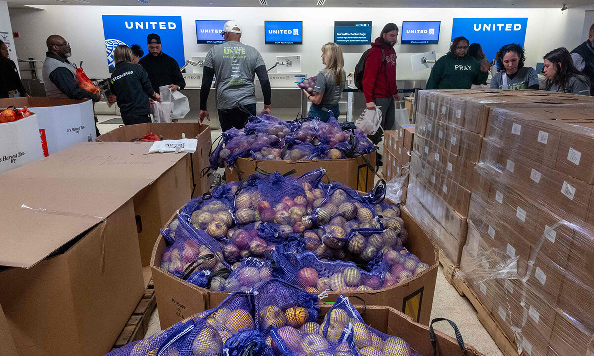 미국 연방정부 셧다운이 이어지고 있는 27일(현지시간) 뉴저지주 뉴어크 리버티 국제공항에서 미 교통안전청(TSA) 직원과 항공관제사 등 연방공무원들이 사과, 감자 등이 들어 있는 식료품 꾸러미를 받고 있다. 셧다운이 장기화하면서 연방공무원 급여가 중단되고 저소득층 식비 지원이 끊기는 등 파장이 커지고 있다.