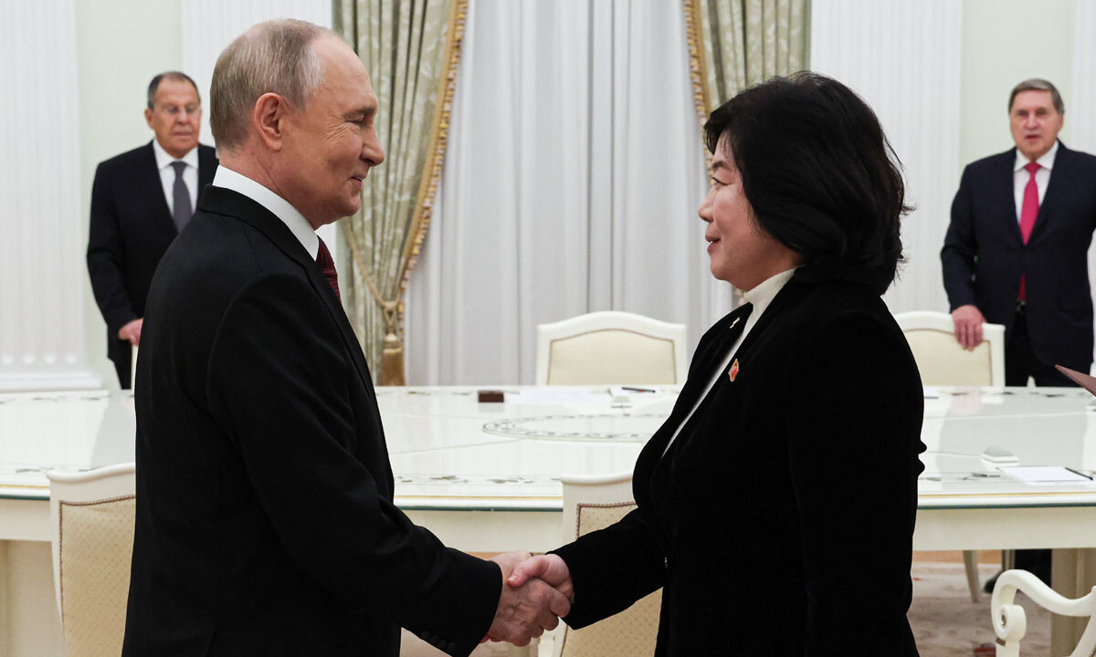 조선중앙통신은 28일 북한에서 외교 업무를 총괄하는 최선희 북한 외무상이 모스크바 크렘린궁에서 블라디미르 푸틴 러시아 대통령을 전날 예방했다고 보도했다. 통신은 최 외무상이 푸틴 대통령에게 김정은 국무위원장이 보내는 “가장 뜨거운 동지적 인사”를 전달했고, 푸틴 대통령은 “따뜻한 인사”를 전해 달라고 부탁했다며 양국 관계를 과시했다.