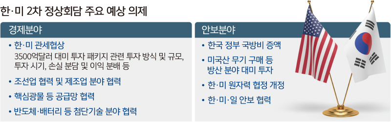 경주 아시아태평양경제협력체(APEC·에이펙) 정상회의를 계기로 29일 열리는 한·미 정상회담에서는 3500억달러 규모 대미 투자 패키지 관련 이견 조율뿐 아니라 양국 협상의 또 다른 축인 안보 분야도 주요 의제로 다뤄질 전망이다. 더불어 양국 정상 모두 공을 들이고 있는 대북 문제와 조선업 협력도 논의 테이블에 오를 것으로 보인다.