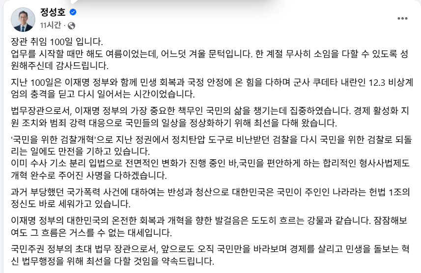 정성호 법무부 장관은 27일 취임 100일을 맞아 “군사쿠데타 내란인 12·3 비상계엄의 충격을 딛고 다시 일어서는 시간이었다”고 소회를 밝혔다.
