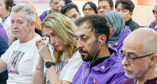 10·29 이태원참사 3주기를 하루 앞둔 28일 서울 종로구 별들의집에서 참사 외국인 유가족 기자간담회가 열렸다. 노르웨이인 희생자 고 스티네 에벤센의 부모가 딸의 얼굴이 새겨진 티셔츠를 입고 눈물을 닦고 있다. 아래는 서울 용산구 이태원역 1번 출구 앞 ‘10·29 기억과 안전의 길’에 붙어 있는 추모 메시지.