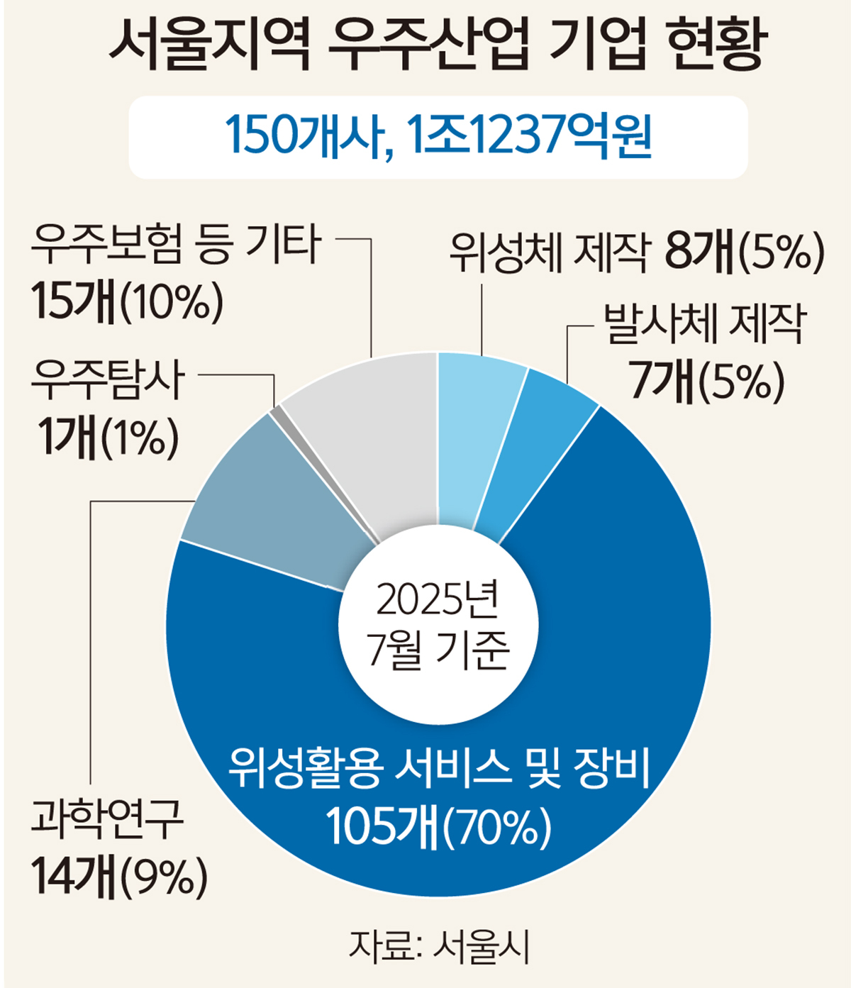 서울은 우리나라 우주산업 기업의 메카다. ‘서울시 우주산업 실태조사’에 따르면 국내 우주산업 기업 469개 중 150개(32%)가 서울에 위치하며, 이들 기업의 매출은 1조704억원으로 국내 전체(약 3조2000억원)의 33%를 차지한다. 전문인력도 2030명으로 전체의 약 25%에 달한다.