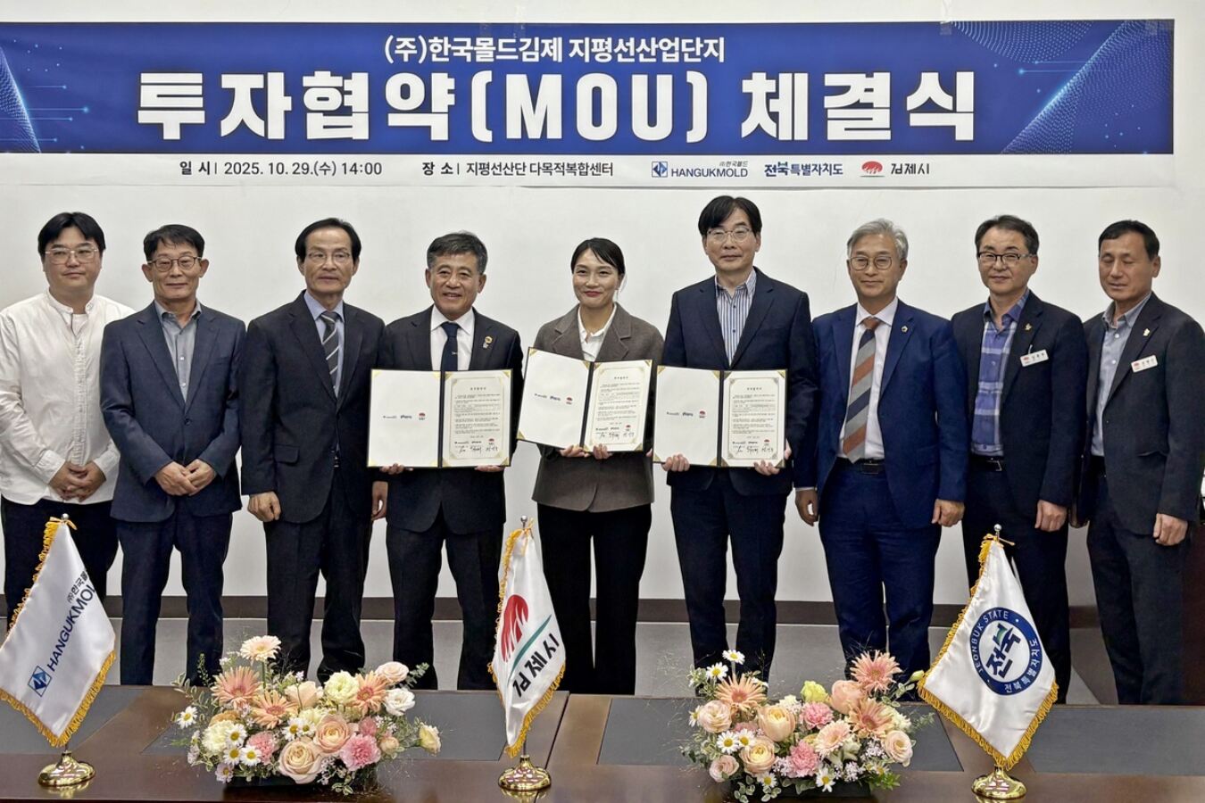 한국몰드김제는 29일 지평선산단 다목적복합센터에서 전북도, 김제시와 함께 투자협약(MOU)을 체결했다.