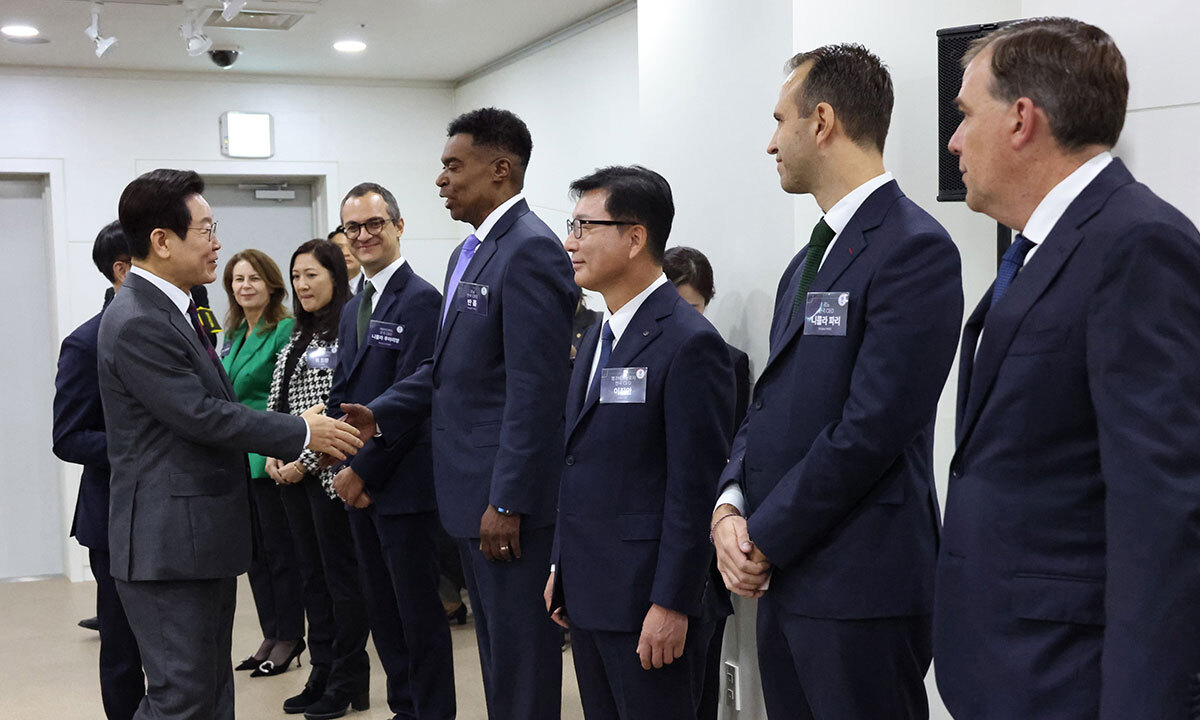 이재명 대통령이 29일 경북 경주 아시아태평양경제협력체(APEC·에이펙) 정상회의를 계기로 경주예술의전당에서 열린 ‘글로벌 기업 투자 파트너십’ 행사에 참석해 아마존웹서비스(AWS), 르노코리아 등 글로벌 기업 7개사 경영진과 인사하고 있다.