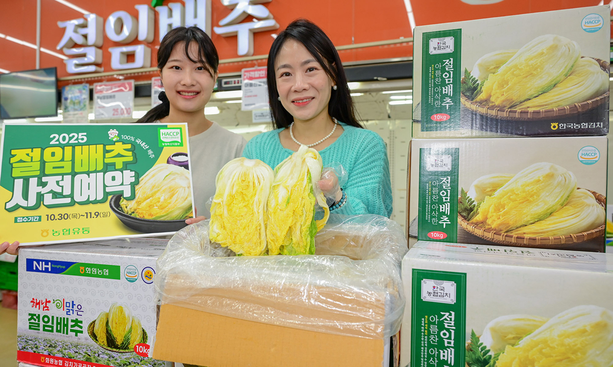 김장철을 앞두고 농협유통 모델들이 29일 서울 서초구 하나로마트 양재점에서 절임 배추를 소개하고 있다. 농협유통은 30일부터 다음 달 9일까지 농협 김치공장에서 생산한 절임 배추를 사전 예약 판매한다고 밝혔다.