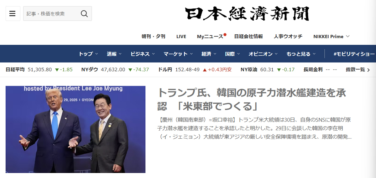 NHK방송은 30일 트럼프 대통령이 소셜미디어 트루스소셜을 통해 “한국이 핵추진 잠수함을 건조할 수 있도록 승인했다”고 밝혔다고 전했다. 방송은 이 소식을 홈페이지 상단에 배치하고 “이재명 대통령이 전날 한·미 정상회담에서 트럼프 대통령에게 이와 관련한 협조를 요청했다”고 보도했다.