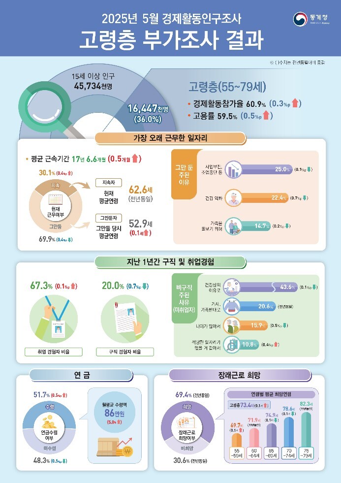 통계청 경제활동인구조사에 따르면 2025년 5월 기준 55세 이상 고령층 취업자는 978만 명으로 전체 55세 이상 인구의 59.5%를 차지했다. 이는 전체 경제활동인구 비율에서도 36%를 차지하며, 연령대별 고용률에서도 중장년층이 청년층을 앞섰다.