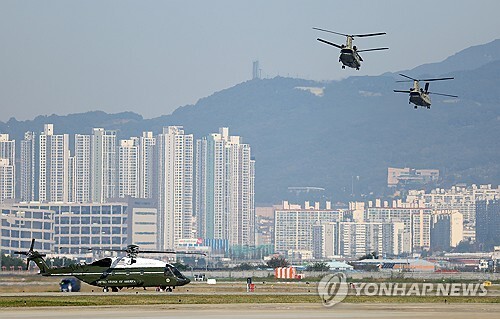 트럼프 대통령을 태운 마린원은 30분도 걸리지 않아 오전 10시 14분께 김해공항 상공에 모습을 드러냈다.