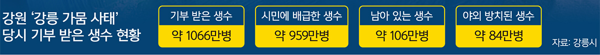 당시 전국에서 생수를 보내는 등 온정이 이어졌다. 강릉시는 두 차례에 걸쳐 시민들에게 생수를 배부했다. 지난달 초 시는 모든 시민들에게 1인당 2ℓ짜리 생수 6병을 지급했다. 며칠 후에는 아파트 주민 1명당 2ℓ짜리 생수 18병, 아파트에 살지 않는 이들에게는 12병을 나눠줬다. 이어 외국인 주민과 사회복지시설, 병원, 어린이집, 소상공인 등에게도 다량의 생수를 풀었다.
