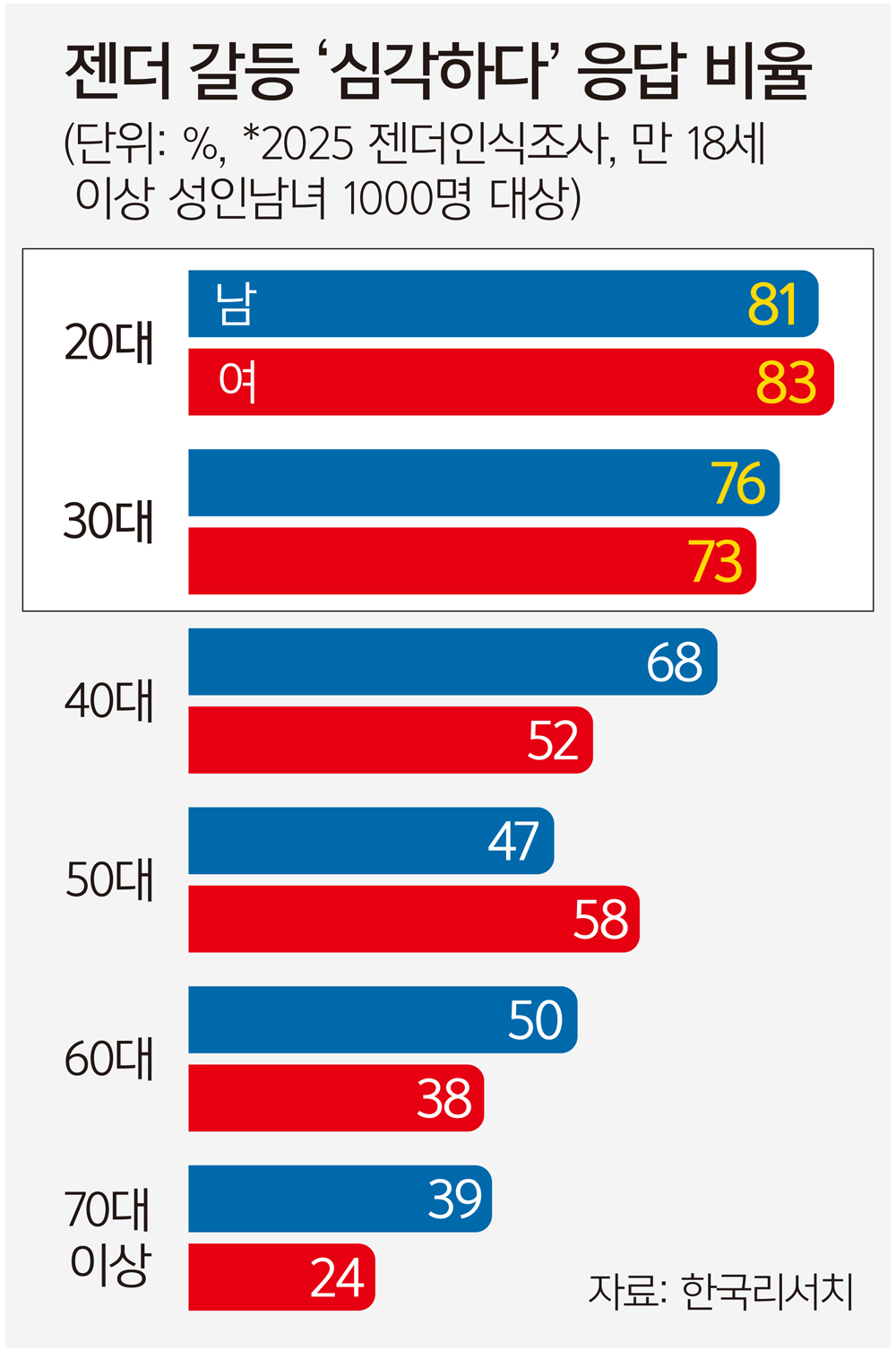 이번 행사는 이재명 대통령이 성평등부에 남성 역차별, 젠더 갈등 관련 대책을 줄곧 주문한 데 따라 마련됐다. 실제 젠더 갈등에 관한 인식은 청년 세대에서 유독 두드러진다. 한국리서치의 ‘2025 젠더인식조사’에서 20대는 10명 중 8명, 30대는 10명 중 7명꼴로 젠더 갈등이 심각한 수준이라고 답했다.