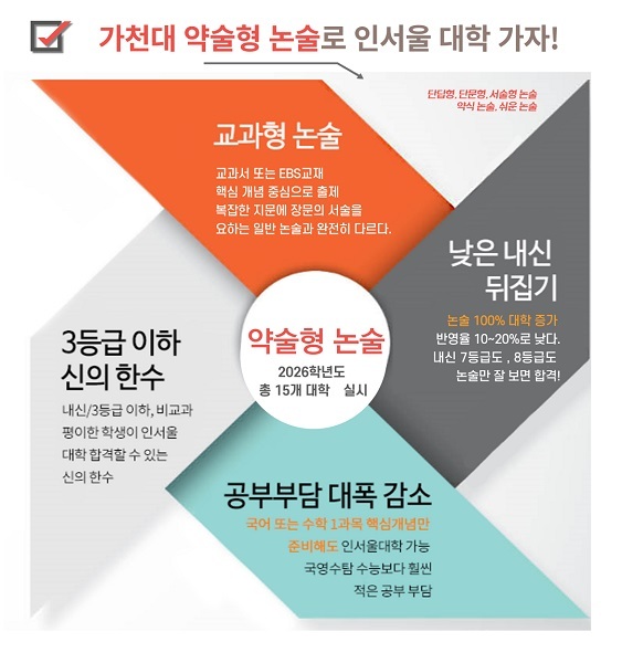 오는 11월 13일(목)에 실시되는 수능에서는 가천대 합격의 1차 관문인 ‘1과목 3등급’을 확보하는 것이 관건으로 작용한다. 수능 이후 가천대 논술은 인문과 간호학과 등이 11월 23일(월), 그 외 자연계열 학과가 11월 24일(화)에 각각 실시된다. 타 대학에 비해 수능 이후 약 10일간의 준비 기간이 주어지므로 이 시기를 활용한 집중 학습 전략이 합격의 핵심으로 꼽힌다. 시험 과목은 인문 자연 모두 국어 수학 2과목이다.