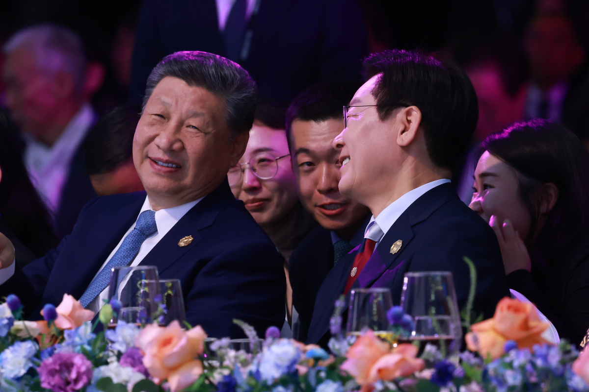 이재명 대통령(오른쪽)과 시진핑 중국 국가주석이 지난 31일 경북 경주시 라한셀렉트호텔에서 열린 '2025 아시아태평양경제협력체(APEC) 정상회의' 환영 만찬에서 대화를 나누고 있다. 연합
