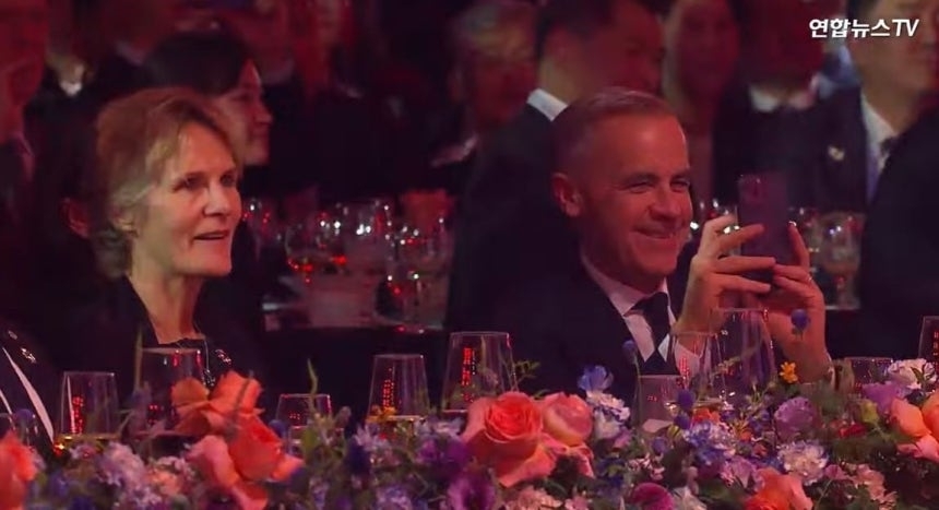 마크 카니(왼쪽) 캐나다 총리가 지난 31일 경북 경주 라한셀렉트호텔 대연회장에서 열린 '2025 아시아태평양경제협력체(APEC) 정상회의' 환영 만찬 공연 무대에 오른 가수 지드래곤을 휴대폰으로 촬영하고 있다. 연합