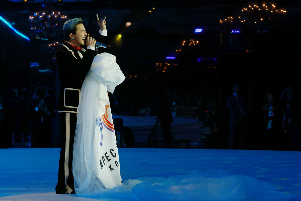 가수 지드래곤이 지난 31일 경북 경주시 라한셀렉트호텔에서 열린 '2025 아시아태평양경제협력체(APEC) 정상회의' 환영 만찬에서 공연을 펼치고 있다. 대통령실