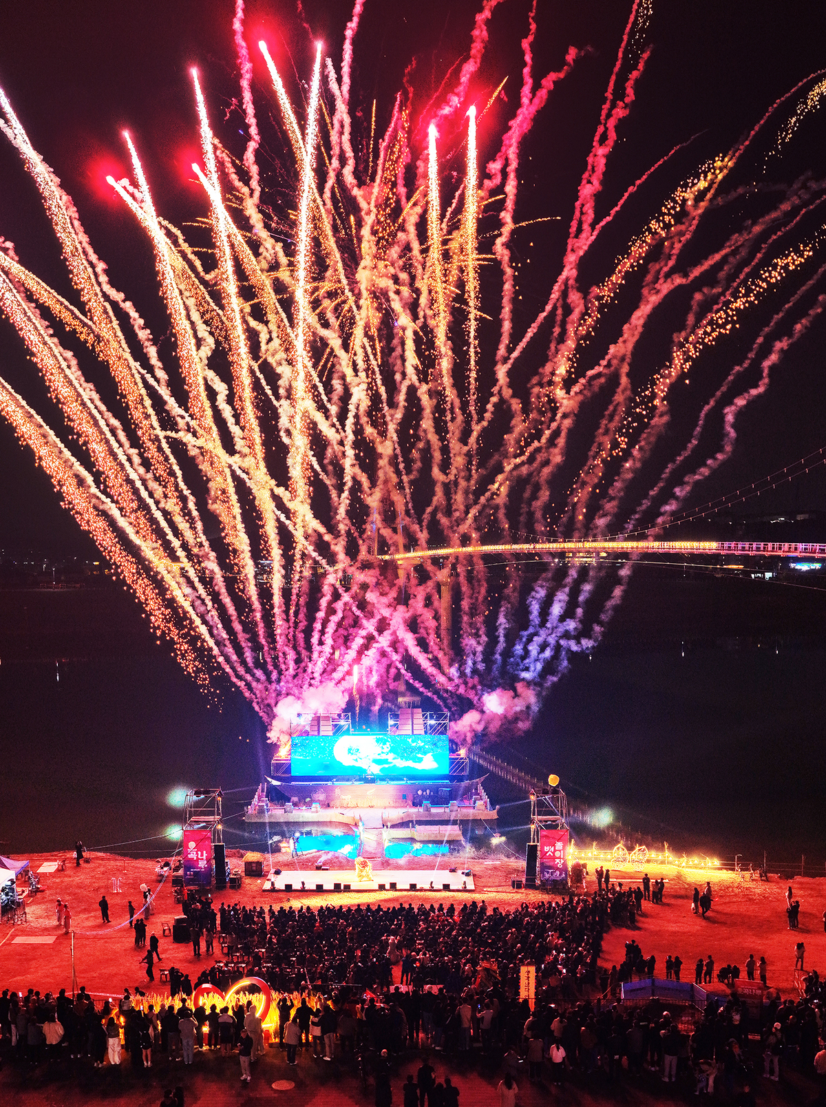 1일 오후 여주시 남한강변 신륵사 관광지 일원에서 열린 2025 여주오곡나루축제 뱃놀이장에서 화려한 불꽃놀이가 펼쳐지고 있다.