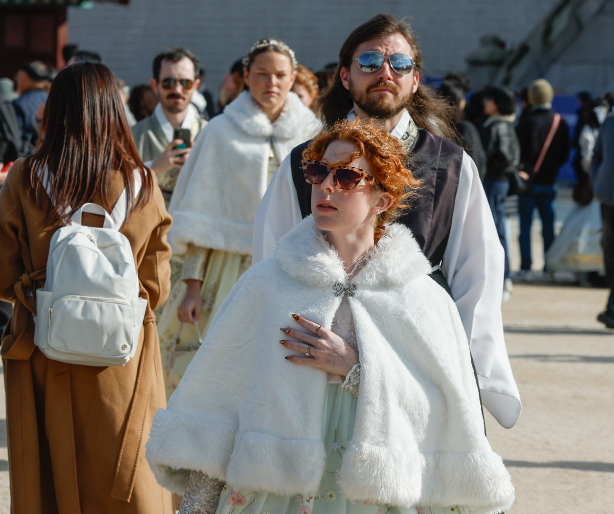 찬 공기가 남하로 초겨울 추위를 보인 2일 서울 종로구 경복궁에서 관광객들이 따듯한 옷을 입고 공연을 지켜보고 있다.