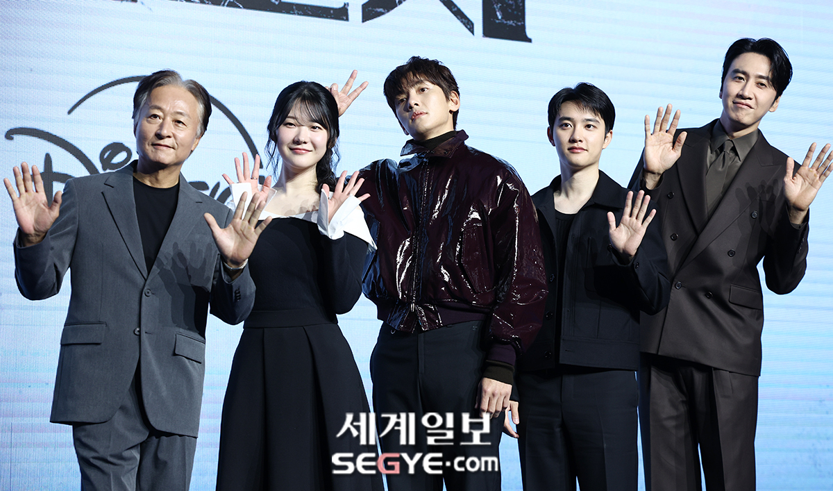 배우 김종수, 조윤수, 지창욱, 도경수, 이광수(사진 왼쪽부터)가 3일 콘래드 서울에서 열린 디즈니+의 오리지널 시리즈 ‘조각도시’ 제작발표회에 참석해 포즈를 취하고 있다.