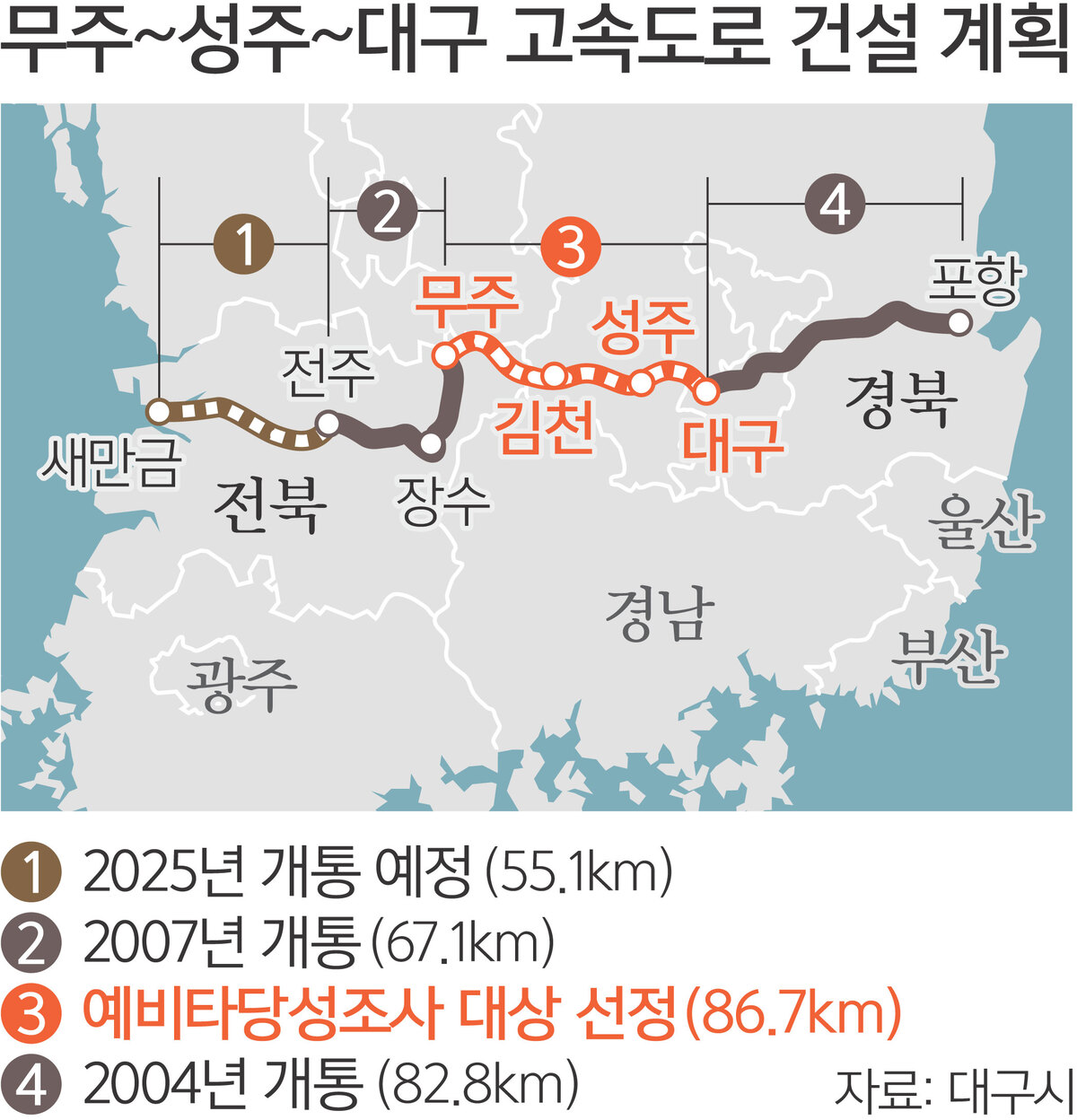 전북 무주군과 경북 성주군, 대구시를 잇는 고속도로 건설사업이 기획재정부 예비타당성조사 대상 사업에 선정됐다. 이에 따라 ‘동서 3축 고속도로’의 유일한 단절 노선을 완성할 수 있는 기틀을 마련했다.