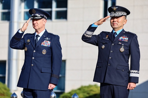 진영승 합참의장(오른쪽)과 존 대니얼 케인 미국 합참의장이 3일 서울 용산구 국방부 연병장에서 열린 제50차 한·미 군사위원회 회의 의장행사에서 경례를 하고 있다. 두 의장은 이날 군사위원회 회의 후 낸 공동보도문에서 전시작전통제권 전환 추진에 “의미있는 진전을 이뤘다”고 밝혔다.