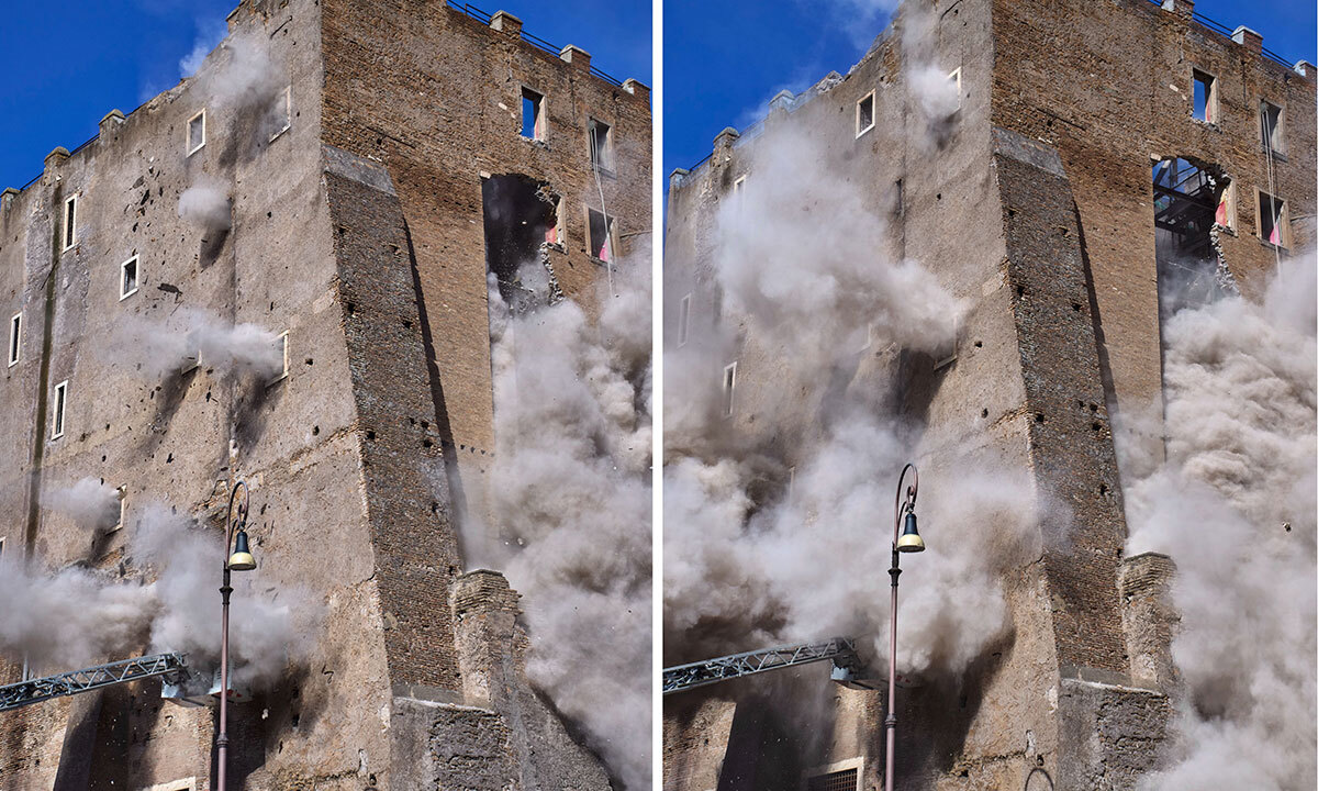 탑은 오전 10시 30분께 내부에서 파편과 흰 연기를 쏟아내며 처음 무너지기 시작했다. 90분 뒤에는 더 많은 흙먼지와 함께 추가 붕괴가 이어졌다.