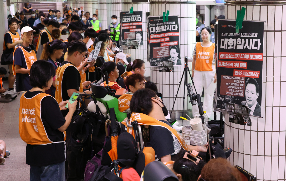 서울교통공사는 “오늘 오전 9시 23분쯤 1호선 서울역에서 특정 장애인 단체의 지하철 시위로 인해 상하선이 무정차 통과 중”이라고 밝혔다.