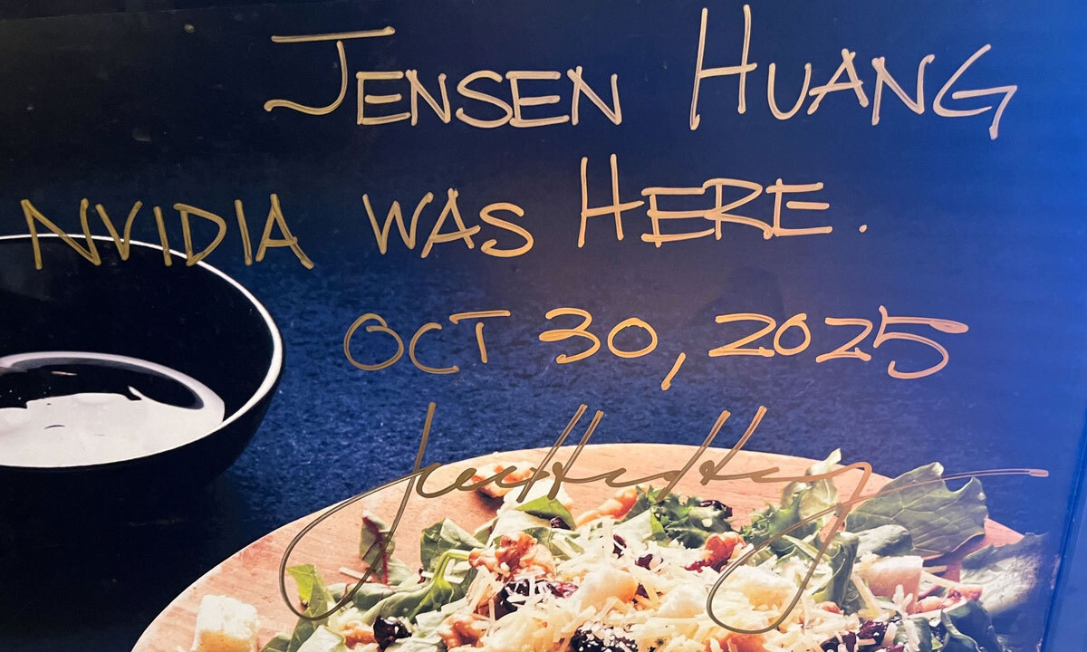 그러면서 가게 안 냉장고에 젠슨 황이 남긴 사인도 보여줬다. 냉장고에는 "젠슨 황, 엔비디아가 여기 있었다"(JENSEN HUANG NVIDA WAS HERE)라는 문구와 함께 날짜(2025년 10월 30일)와 황 CEO의 사인이 쓰여 있었다.