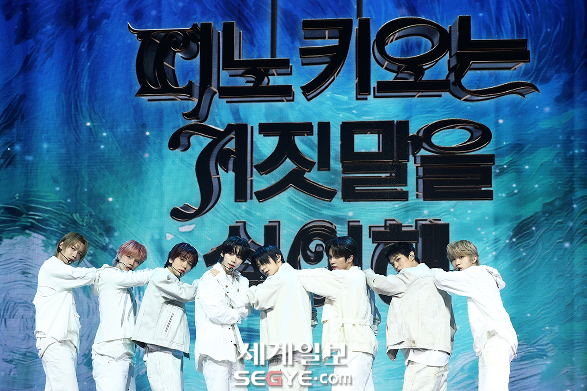 그룹 아홉(AHOF)이 4일 서울 광장동 예스24 라이브홀에서 열린 두 번째 미니앨범 'The Passage(더 패시지)' 쇼케이스에 참석해 열띤 공연을 펼치고 있다.