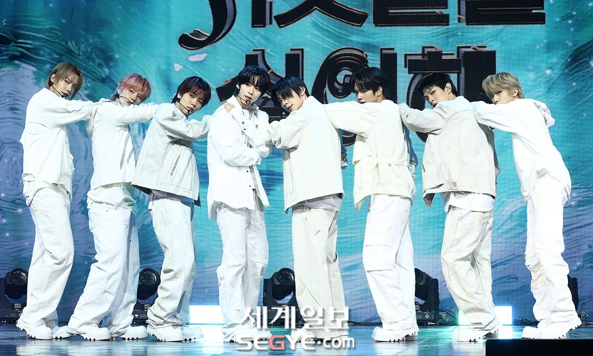 그룹 아홉(AHOF)이 4일 서울 광장동 예스24 라이브홀에서 열린 두 번째 미니앨범 'The Passage(더 패시지)' 쇼케이스에 참석해 열띤 공연을 펼치고 있다.