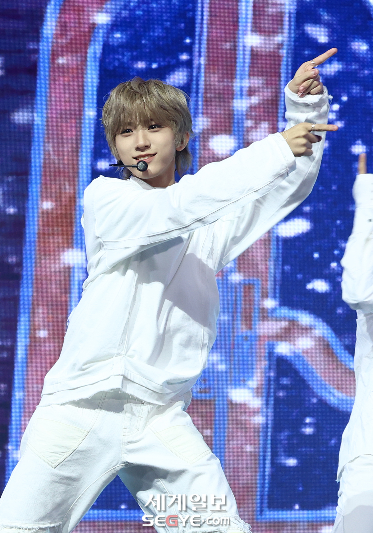 그룹 아홉(AHOF) 다이스케가 4일 서울 광장동 예스24 라이브홀에서 열린 두 번째 미니앨범 'The Passage(더 패시지)' 쇼케이스에 참석해 열띤 공연을 펼치고 있다.