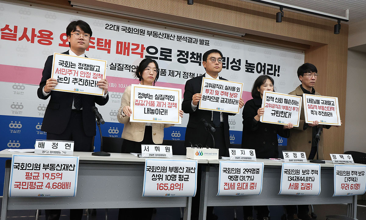 경제정의실천시민연합 관계자들이 4일 서울 종로구 경실련 강당에서 ‘22대 국회의원 부동산재산 분석결과’ 발표를 앞두고 공직자의 부동산 투기 방지와 부동산 대책 마련을 촉구하고 있다.